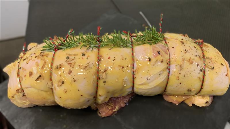 Μπουτάκι από χοιρίδιο γάλακτος με πέτσα γεμιστό με χαλούμι, κουκουνάρι, δαμάσκηνο και μαρινάδα μουστάρδας.